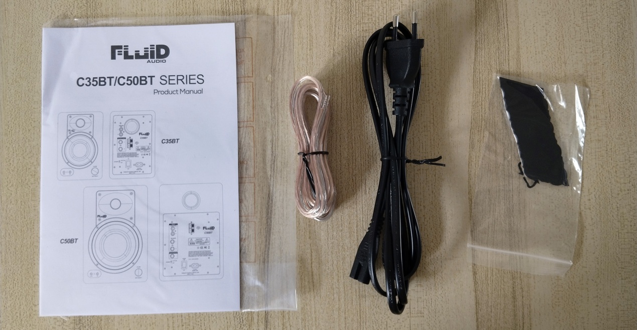 音箱标配附件:用户手册、音箱连接线、电源线、不干胶脚垫。见下图所示。