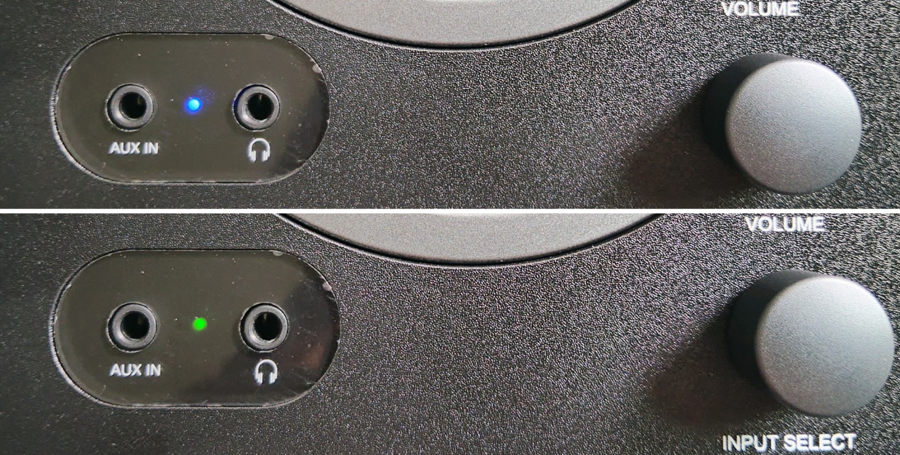 控制方面,C35BT采用物理旋钮+拨动开关设计,整体布局清晰。主音量旋钮采用了无限旋转步进式电位器,允许用户逐级增加或减小音量。这种设计在音箱上较为少见,可以算得上是辨识性特征之一。但是,音量旋钮上没有任何标识,加之无限旋转的特性,很难判断音量位置,只能从实际音量上判断。此外,该旋钮还是蓝牙开关,当按下时,可以关闭蓝牙功能,适合选择线性输入源时使用。默认状态下,蓝牙是开启的。其状态可以通过音箱上的指示灯判断(蓝灯闪烁表示蓝牙未连接,常亮表示蓝牙连接成功;绿灯表示蓝牙关闭),见下图所示。