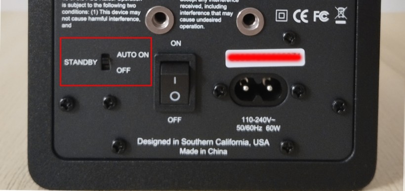 控制方面,提供了待机(STANDBY)功能(见下图红框内所示),可通过后面板开关禁用或启动自动待机功能。目前很多监听音箱都配备了该功能,主要用于节能,以及延缓音箱的使用寿命。C35BT开启待机后,如果5分钟内没有检测到音频信号通过音箱,那么将自动进入待机状态。当有音频信号通过音箱时,待机会被解除,恢复到正常工作状态,可以理解为被唤醒。