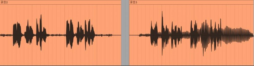 语言人声测试,用于呈现中频/低频的表现。两段人声以相同的电平进行录音,图左是使用Superlux ECM999测量麦克风录制的结果,图右是使用X50B MKII录制的结果。波形见下图。