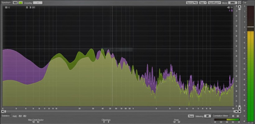 FET电路常赋予中频/低频一种类似电子管的“模拟感”温暖质感,下图的频谱分析(Superlux ECM999为绿色波形;X50B MKII为紫色波形)中可以看到,X50B MKII的中频/低频明显更加饱满、有厚度,高频的谐波成分也更多,听感自然顺滑,音质介于驻极体的“直白”和电子管的“浓郁”之间。(注:频谱截图具有实时性,无法表现出完整的动态变化)