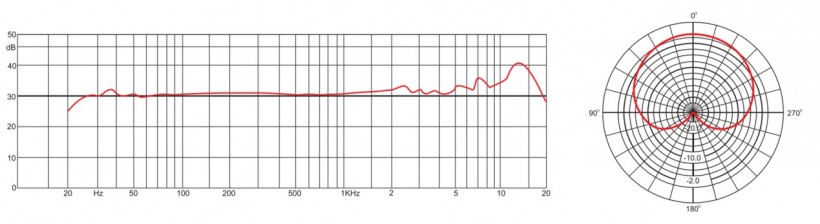 心型指向性(见下图右)。0°正前方响应最强,基准0dB;180°正后方衰减约 -20dB,90°/270°两侧衰减约 -6dB,可有效抑制侧后方噪音,适合单一声源录制(如主播、独唱),但在未经过声学处理的室内可能因反射声导致频响不平直,且多角度拾音需调整麦克风位置。